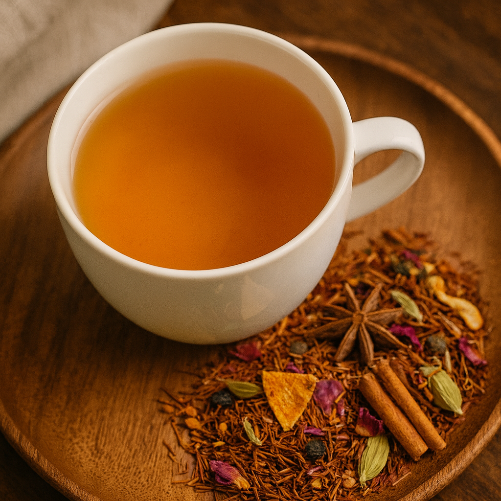 Състав: ройбос, стафиди, портокалови кори, портокалови парченца, аромати, парченца ябълка, канела- 4%, звездовиден анасон- 4%, кардамон – 4%, копър, кокосов чипс, печен бадем, черен пипер 2%, карамфил – 2%, розов цвят, листа от роза.