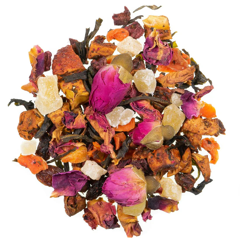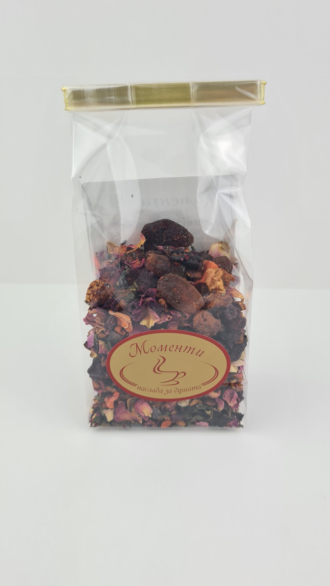 Състав: Ябълка парченца, бял чай Китай, Мао Feng-15%, стафиди, моркови, цвекло, захаросани парченца ананас (ананас, захар), аромат, розов цвят листа, рози, праскови.