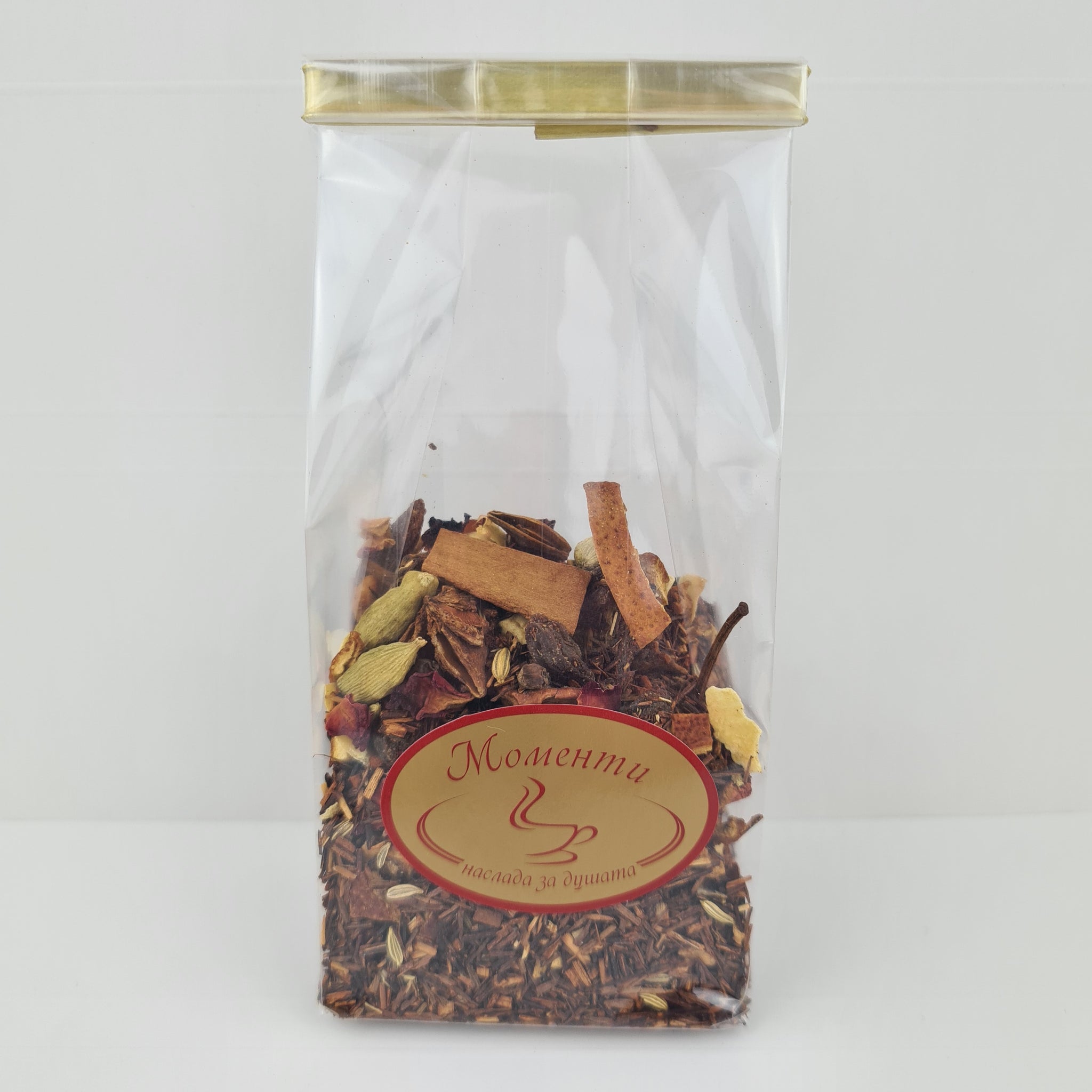 Ingrediente: rooibos, stafide, coaja de portocala, bucati de portocala, arome, bucati de mere, scortisoara - 4%, anason stelat - 4%, cardamom - 4%, fenicul, chipsuri de cocos, migdale prajite, piper negru 2%, cuisoare - 2%, floare de trandafir, frunze de trandafir.